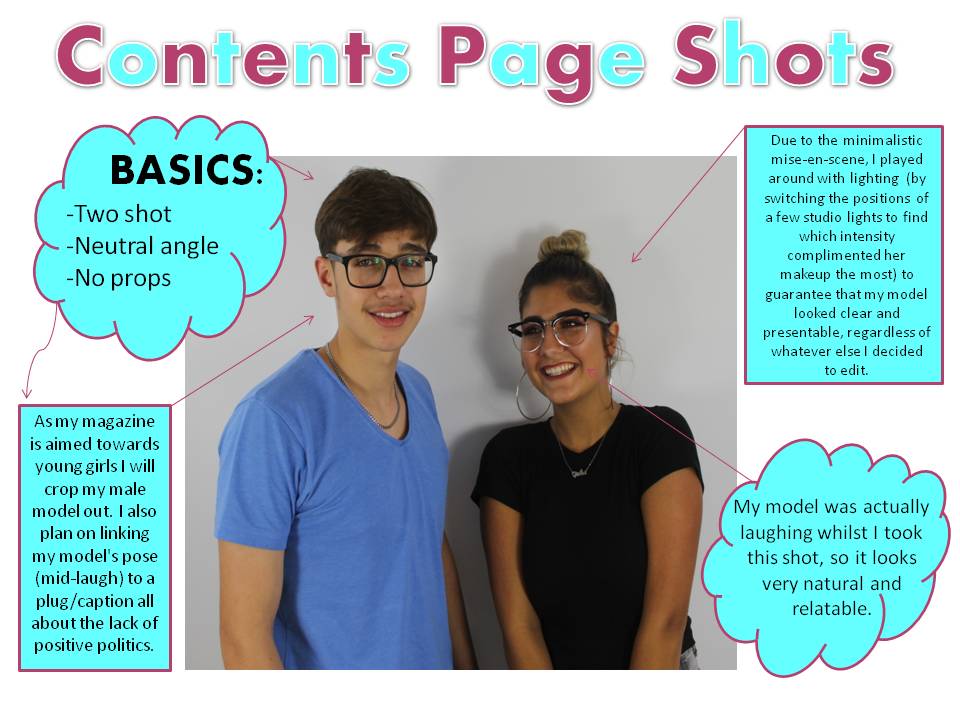 For my contents page I researched a variety of different layouts until I eventually found one I felt suited my magazine the most... I will consider different shots from my shot list before deciding on my final images, but I plan on using two clear images (one at a neutral angle in the media studio with minimal makeup and a campaign top, and the other at a low angle in the playground with props such as tables and a ballot box, as well as a politics revision book). I plan on using graphics such as rectangles behind text to emphasize the main elements of each article/caption (eg. 'BREXIT') and including page numbers as well as an explanation in a smaller font beneath. I also used exactly the same 'Bubblegum' font from the website 'Dafont' and plan on incorporating my feature colours.